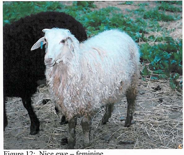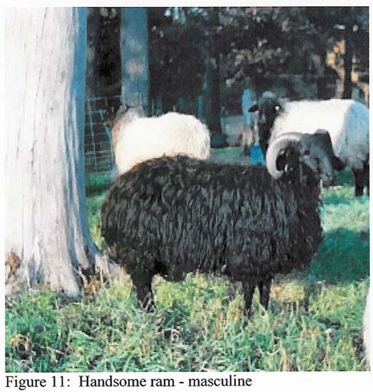 Breed Characteristics should reflect the Karakuls survival and evolvement in its unique environment. Breed guidelines to this uniqueness should be based on logic and common sense, but should not be so narrow and restricting as to jeopardize diversity. Rams should look like rams, masculine and rugged, while ewes should be dainty, feminine, and pretty. (Figure 12) (Click to view picture)
