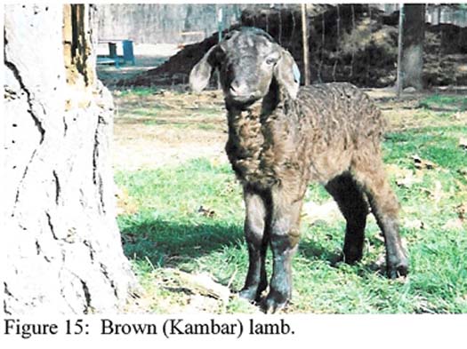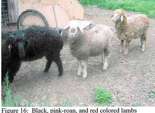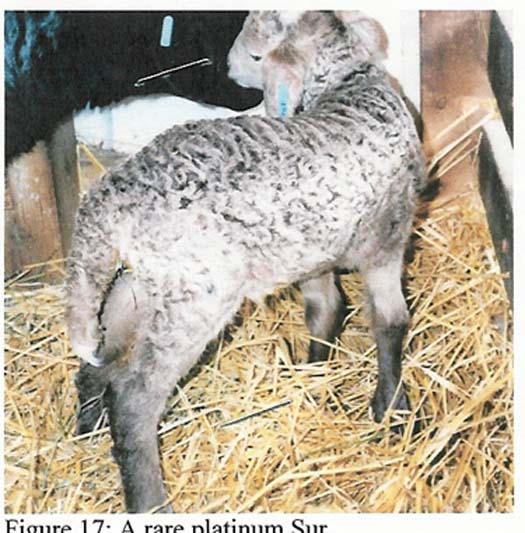 The dominant fleece color in the Karakul is black (Arabi), with recessive genetics for pink-roan (Guligas), red-brown (Kambar), (Figures 15 and Figure 16) (Click to view picture) and gray (Sharazi--which is a very even bluish intermixture of black and white fibers). Rare agouti coloration, called Sur, can occur in the newborn. The Sur has a brown base with a pale frosted metallic effect on the tips of the birth coat varying from bronze to gold, platinum, or amber. (Figure 17) (Click to view picture)