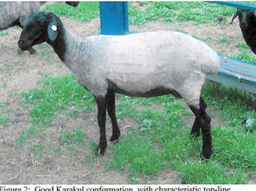 CONFORMATION. The Karakul stands apart from other breeds with its conformation and fiber. Their conformation is different, perhaps an adaptation to the unique environment of south western Asia and the mountainous desert regions around the Caspian Sea. Conformation is the way an animal is put-together, so that the animal's health, well-being, longevity, and productivity are not compromised. Conformation is a combination of soundness, structure, balance, and breed character; we will discuss each one as they apply to an "Ideal" Karakul. (Figure 2) (Click to view picture)