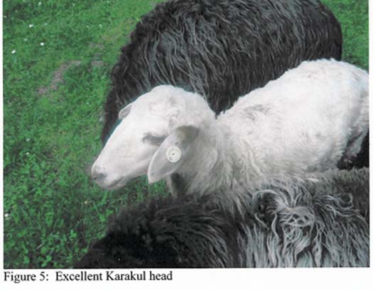 STRUCTURE, or structural correctness, is the way parts are put together or arranged to form the whole animal. This includes volume, capacity, or depth of body with plenty of room for the heart, lungs, rumen, and lambs. The Karakul head should be long and narrow with a prominent forehead. Hair covering should be glossy and free from wool. Ears can range form 'no-ear', to tiny V-shaped, to large U-shaped, and anything in between, as long as they point naturally downward and slightly forward. Large ears should be thin and pliable, while small ears should be thicker. Eyes should be wide set in prominent eye sockets. A narrow, arched, lustrous nose should end in a narrow muzzle, with narrow nostrils and thin lips. (Figure 5) (Click to view picture)