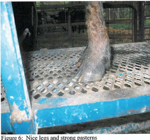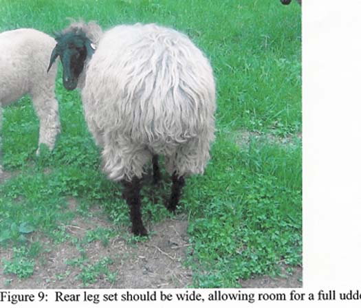 Long, fine, slender boned legs should be straight, come squarely out of each corner of the body, and end with strong pasterns and small feet. (Figure 6) (Click to view picture) Rear legs on ewes should be wide set, allowing plenty of room for a full udder. (Figure 9) (Click to view picture) Some of the earliest text indicates that cow-hocked ewes were better pelt producers, today this is not a desirable trait. (Figure 10) (Click to view picture)