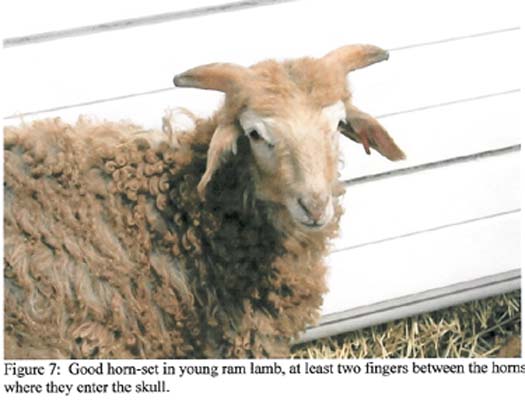 Horns on rams, if present, should have at least two fingers width between the horns where they enter the skull and should be well set away from the head. (Figure 7) (Click to view picture) Horns should not touch the jaw or in anyway hinder or endanger the life of the animal. (Figure 8) (Click to view picture)